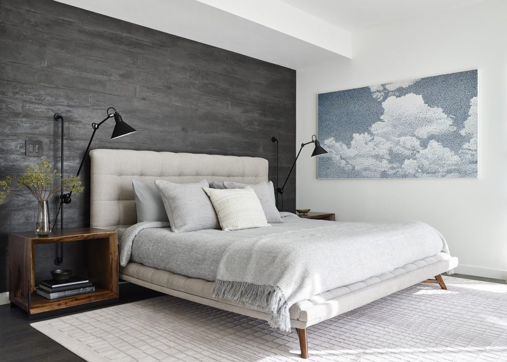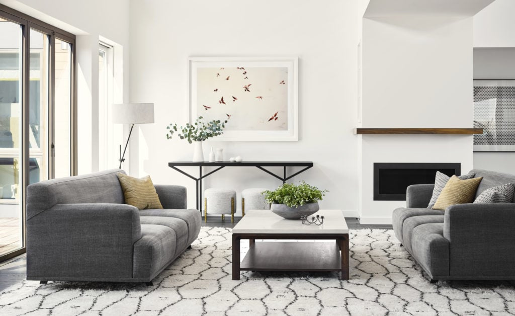 The furnishings blend mid-century shapes with low-profile modern pieces for a relaxed, informal vibe. Textural rugs and fabrics and hand crafted wood pieces add warmth and layers to the space, allowing the contemporary artwork to take center stage. A variety of local artisans left their touch on the home, including a custom 11 foot long rift oak dining table with molded plywood pendant lights above. The living room is grounded by two custom eco-friendly sofas made of natural latex, organic wool, and FSC-certified wood frames.