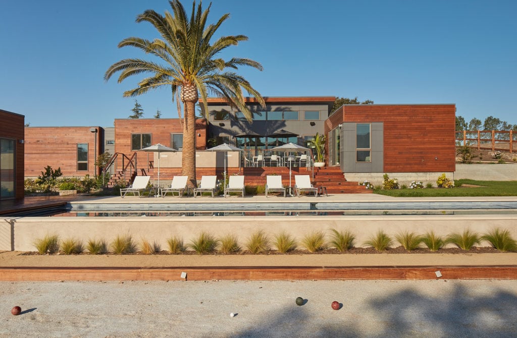 Our busy San Francisco clients were in search of a Napa Valley retreat to escape on the weekends with their young daughters. They found their dream property overlooking the rolling hills and vineyards of wine country and approached prefab builder Blu Homes with their vision of building a sustainable vacation home with expansive outdoor spaces. Napa Interior Designer, Niche Interiors, worked closely with Blu Homes to select finishes and fixtures and to customize this energy-efficient prefab home, with bespoke features such as the faux-bois plaster wall in the primary bedroom, floor to ceiling chalkboard cabinetry in the kitchen, and woodsy wallpaper in the girls bedroom. Niche Interiors collaborated with Terra Ferma Landscapes on the outdoor spaces, creating custom cushions and pillows for the fire pit and outfitting the pool cabana with sheer drapes to filter the sun on warm summer days.