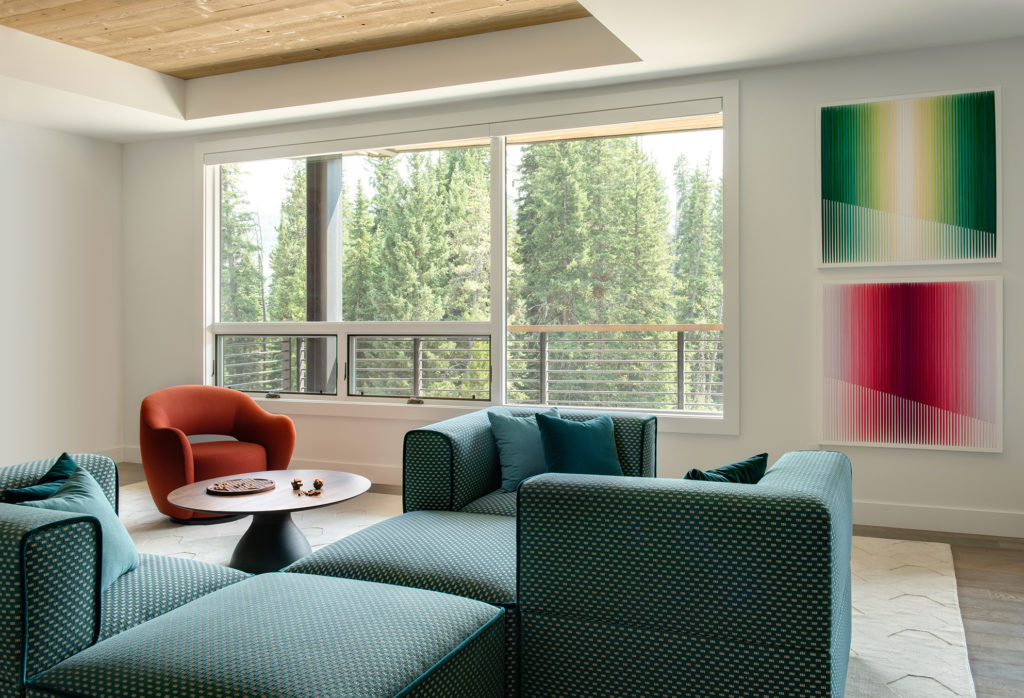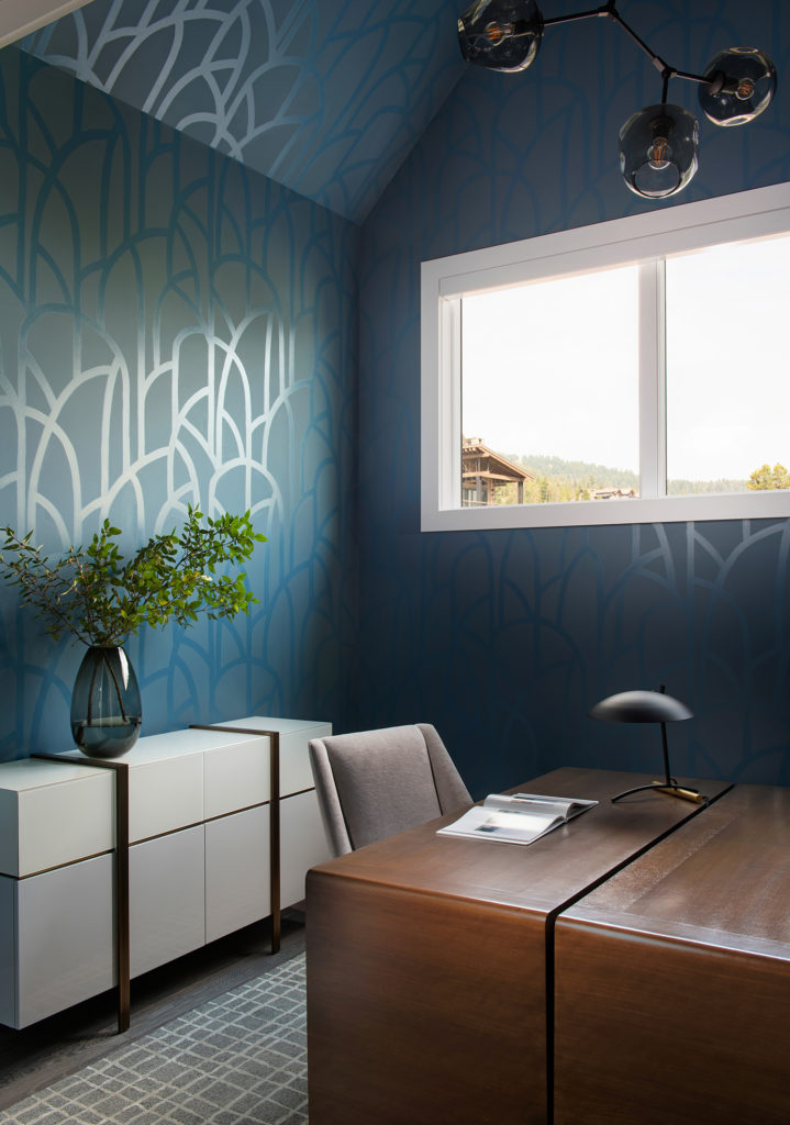 When our longtime client purchased a vacation home at the exclusive Yellowstone Club we couldn’t wait to customize the 7,000 square foot space for their cosmopolitan family. We layered in sophisticated contemporary furnishings in saturated jewel tones with playful patterns, hand-painted wall treatments and statement lighting for a stylish (but not too serious) mountain retreat. Sculptural sofas flank the fireplace in the formal living room with walnut and steel coffee tables and artwork by Melissa Dickenson. The warm, neutral palette continues in the dining room which features a walnut table with brass inlay, oversized artwork and a dramatic light fixture.