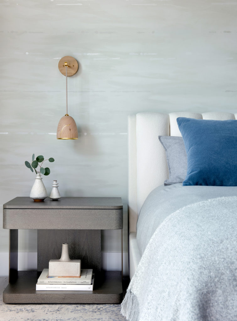 Hand-painted walls by San Francisco artist Caroline Lizarraga serve as the backdrop in the luxe primary bedroom as well as in the office. The media room features a modular 7 piece sectional which provides flexible lounging for movie watching and playing games. We optimized the home to accommodate frequent houseguests, with custom double queen beds in the guest rooms and a bespoke bunk bed in the kids bedroom.